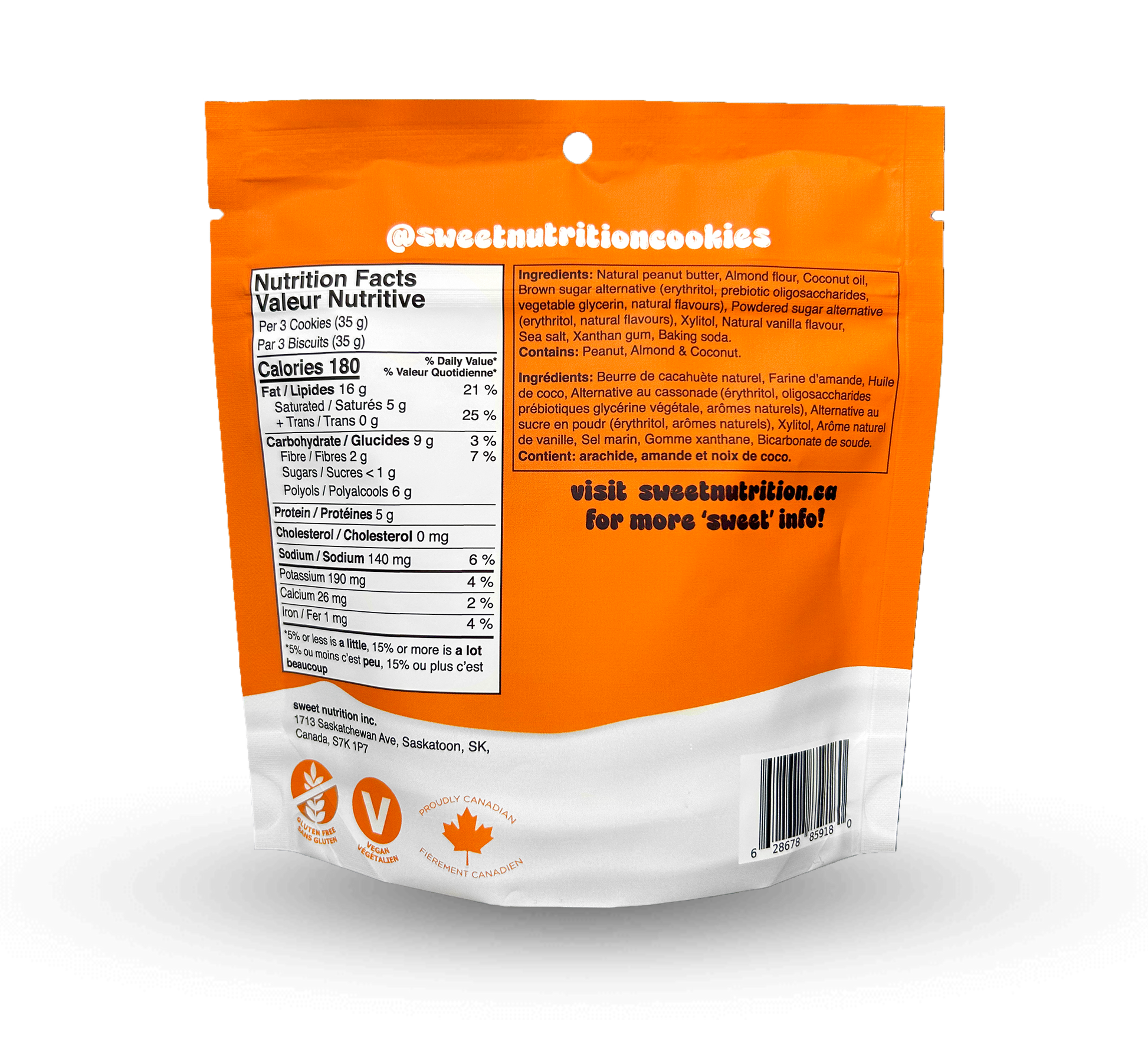 We manufacture our cookies ourselves in the Sweet Nutrition Cookie Factory, located in Saskatoon, Saskatchewan, Canada.